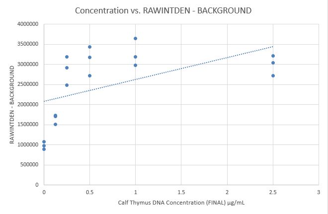 Placing Samples onto the Fluorimeter 1. Insert the slide into the fluorimeter, smooth side down. 2. Use the micropipette to place 80µL of the SYBR green dye in the second row of the middle column of the slide. 3. Micropipette 80µL of the specific calf thymus DNA on top of the SYBR green dye. 4. Ensure that the light is turned on. Then start self timer on phone and place light box over entire set up.