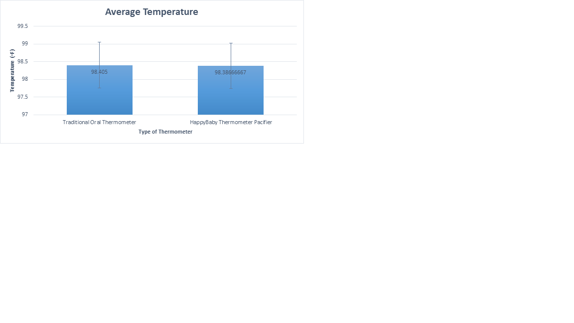 Inferential StatisticsWe found 60 test subjects which we asked to measure temperature. 30 measured using our device immediately followed by the traditional oral device. The other 30 measured using the traditional thermometer immediately followed by our device. Their temperatures were recorded and compared. Null Hypothesis: The temperatures of the two thermometers are the same Alternative Hypothesis: The temperatures of the two thermometers are different. Traditional Oral Thermometer: AVG-98.405 SD-0.642142864 HappyBaby Thermometer Pacifier AVG-98.38666667 SD-0.696107012 T-Test → p value= .76565 From this, (p-value & error bar overlap on graph) we fail to reject the null hypothesis showing that our device’s accuracy in measuring temperature is comparable to that of the proven traditional oral sensor.