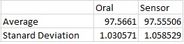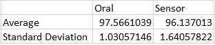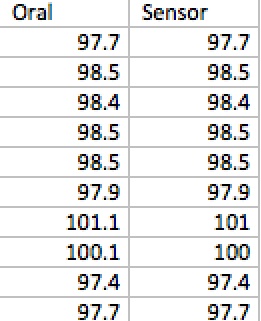 Inferential Statistics and Data SetSample of Data After running a T-test, the p-value was calculated to be 0.73024611. There is no statistical significance in this experiment because the calculated p-value is over 0.05. This shows that the headphone sensors measure body temperature very similar to the oral thermometer. This makes the headphones a reliable way to measure body temperature. Pearson's R Coefficient was calculated to be 0.92612218. This value is very close to 1 which means there is a positive correlation between body temperature measurements taken by the headphones and body temperature measurements taken by the oral thermometer. This shows that most of the time the headphones measure body temperature as accurate as an oral thermometer.
