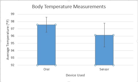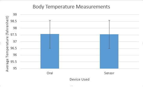 AnalysisCorrelation Coefficient: 0.021715 Pearson's R value is 0.021715 which is very close to zero. This means there is no correlation between body temperature measured by the sensor and body temperature measured my the oral thermometer. This shows that the sensor does not accurately measure body temperature over a period of time. The p-value is approximately 8.0486E-18. There is a statistical significance in this experiment because the calculated p-value is under 0.05. This shows that there is a difference between the body temperature measured by the sensor and body temperature measured by the oral thermometer. This shows that the sensor is not a reliable measure of body temperature.