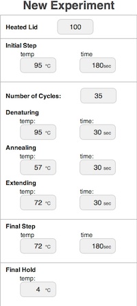 ProtocolsFirst Step: 95[math]\displaystyle{ ^o }[/math]C for 180 seconds Second Step: 35 cycles of denaturing,annealing, and extending (in that respected order). Denaturing: 95[math]\displaystyle{ ^o }[/math]C for 30 seconds Annealing: 57[math]\displaystyle{ ^o }[/math]C for 30 seconds Extending: 72[math]\displaystyle{ ^o }[/math]C for 30 seconds Last Step: 72[math]\displaystyle{ ^o }[/math]C for 180 seconds Hold: 4[math]\displaystyle{ ^o }[/math]C DNA Sample: 50 μL each. Patient ID's from the UnderGrad Teaching Assistant(UGTA) DNA Sample Set-up