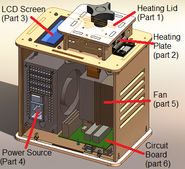 There were six different parts of the OpenPCR machine that we looked at when we disassembled it. This included the heating lid (part 1), the heating plate (part 2), the LCD screen (part 3), the power supply (part 4), the fan (part 5), and the circuit board (part 6). If all of the parts and connections are not working properly, then the machine as a whole will not work. If the heating lid (part 1) did not work, the machine would not be able to maintain a specific heat, because it would be affected by the surrounding environment. If the heating plate (part 2) did not work, then the machine would not be able to control the temperature of the PCR tubes. If the power supply (part 4) did not work, then the machine as a whole would not be able to work. When we unplugged the LCD screen (part 3) from the circuit board (part 6), the machine no longer displayed any data on the LCD screen. When we unplugged the white wire that connects the circuit board (part 6) to the heating plate (part 2), the machine displayed a false reading of the temperature. It dropped from 27.8 degrees Celsius to -40.0 degrees Celsius.