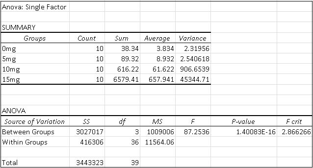 The group used ANOVA to analyze and determine if the differences between the group of human subjects were significant. The ANOVA produced a p-value that is <0.05, which means that the differences between the group of human subjects were significant. Subsequently,six post-hoc tests were conducted to determine if there is significant difference between the human group individually; all post-hoc t-tests resulted in a p-value that is way <0.05 (i.e. <.00833). Therefore, the group concluded that there is statistical evidence that the LPS treatment was effective on humans.