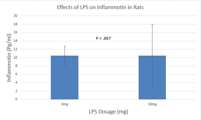In rats, the lipopolysaccharide was not able to increase the amount of inflammatory proteins. By running a t test, we found a p value of 0.8674. There was no statistically significant evidence to support the hypothesis that this inflammation inducing agent can increase the number of Inflammotin since the p-value from the t-test was greater than .05.