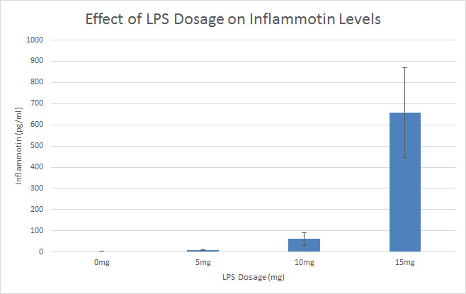 On the first experiment (human study), the dosage of LPS in mg was increased by increments of five (0 mg, 5 mg, 10 mg, and 15 mg). The graph of the results depicts that there is a significant difference in the effect of LPS on inflammatory protein (inflammotin) for elderly people. There was a slight increase of inflammotin protein levels when the LPS dosage is 5 mg and 10 mg. But when the LPS dosage was increased from 10 mg to 15 mg, the amount of inflammotin protein levels in the blood increase significantly. In brief, when the dosage of LPS being administered to humans is