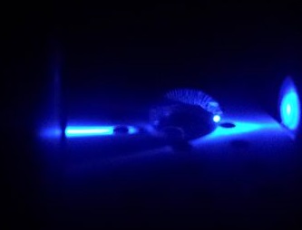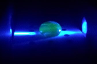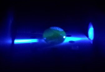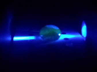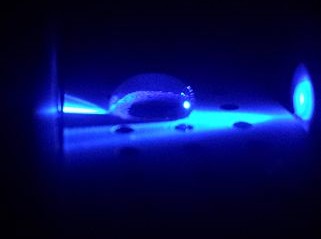 The flourimeter was raised using a white plastic box. The camera was placed in the cradle in front of the fluorimeter and the camera application selected. There was a black box covering the whole set to not have any outside source of light. Based on the view of the blue light, the camera position was adjusted until the droplet would be large and centered on the screen. The camera phone was set to focus on the drop. The distance between the drop and cradle was then measured.