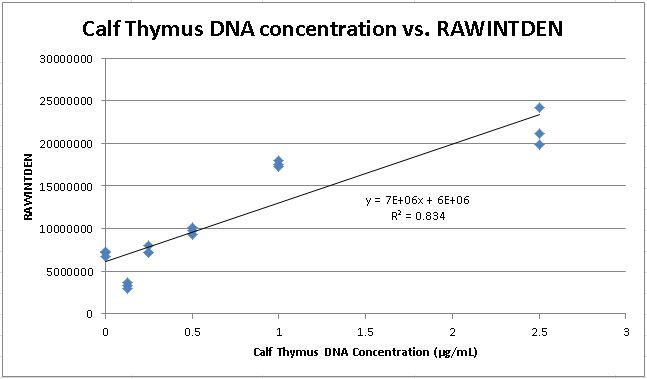 The technique used in the lab detected the fluorescence of the light using wavelengths. The way the fluorometer works is by first mixing the DNA and with the SYBR Green dye. The mixed substance is placed onto the middle of the hydrophobic glass slide, which is placed in the fluorometer. The switch is turned on so that the blue LED light appears. The slide is positioned so that the blue light goes through the DNA sample on the slide. The blue LED light interacts with the green dye which emits a green color. Now the DNA will light up with a certain shade of green and that depends on the concentration of the DNA that was placed on the glass slide. The darker or brighter the green color is indicates a higher concentration of DNA. With images taken of the fluorescence DNA, it can be calibrated and analyzed to see the results of how intense the fluorescence is. Which can be used to see about how much the DNA concentration was in the substance.