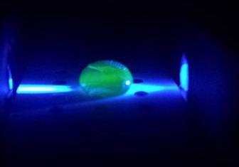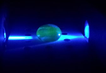 The "drop" Fluorimeter device used in this lab was a black box with a space in the middle. The space in the middle was used to easily slide in the hydrophobic glass slides. The hydrophobic glass slide was multi-welled to help with placement of our drop. The slide is coated in Teflon which allows the sample to maintain its shape in a spherical drops on the surface of the slide. The Hydrophobic slides were used so that the drops of DNA could stay as a bubble. It is able to stay as a bubble due to the hydrophobic properties. There is a switch on the right side of the box and when it is flipped, the fluorimeter transmits a blue LED light. The glass slide is positioned so that the blue light goes through the DNA sample.