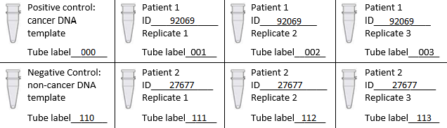 Label each tube, and fill it with 50 μL of the corresponding DNA/primer mix (based on the table above) using a pipette. (only one disposable tip pipette is to be used for each sample to avoid cross-contamination.)