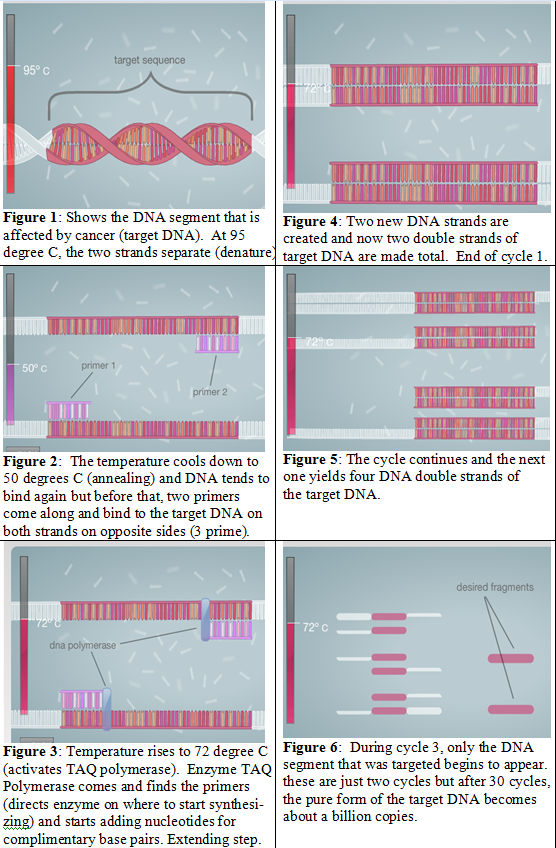 PCR serves multiple functions for us. By amplifying our DNA segment, we are able to detect viral infections or bacterial infections. Below is an image of the part of DNA that is affected by cancer. These six figures show how that specific segment of DNA is amplified.