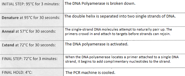 During the initial step, the machine is set to 95 degrees for 3 minutes. During this time the DNA polyamerase is broken down. During the denature stage the machine heats up the sample to 95 degrees for an additional 30 seconds. During this period the double helix is separated into two single strands of DNA. The anneal stage is when the sample is cooled down to 57 degrees for 30 seconds. It is then that the single-strand DNA molecules attempt to naturally pair up. The primers crowd in and lock onto targets before strands rejoin. During the extend phase, the sample is heated back up to 72 degrees for 30 seconds and the DNA polyamerase is activated. The final step includes maintaining the 72 degree temperature for three more minutes. This is when the DNA polyamerase locates a primer attached to a single DNA strand. I begins to add complimentary nucleotides to the strand.