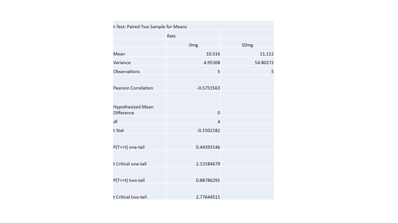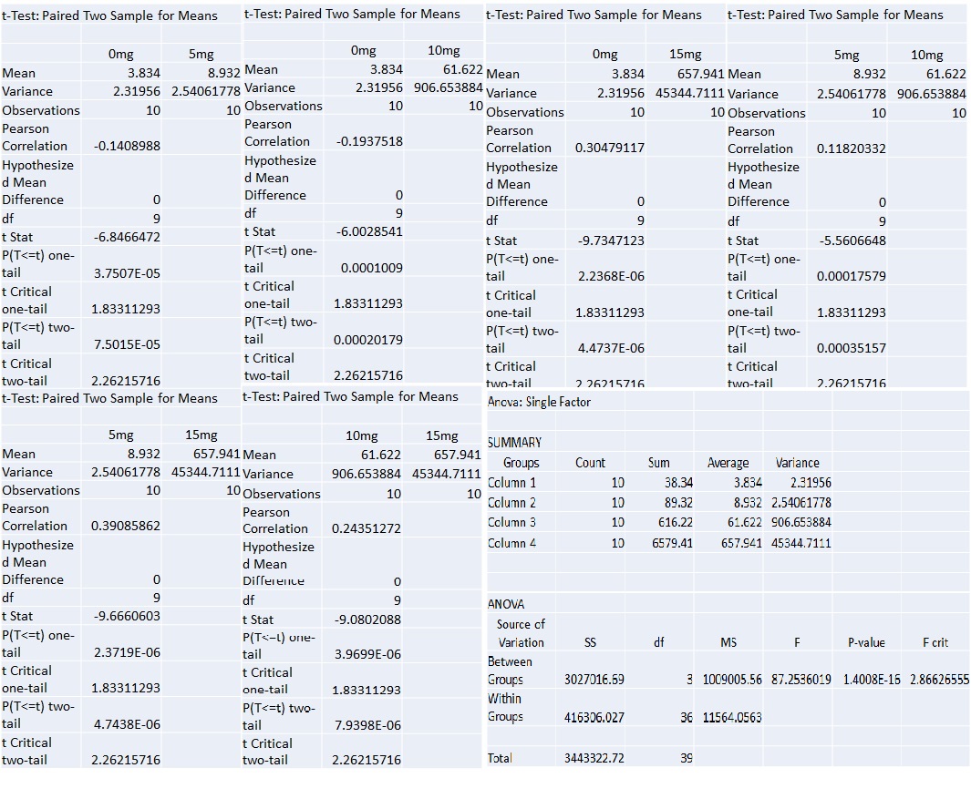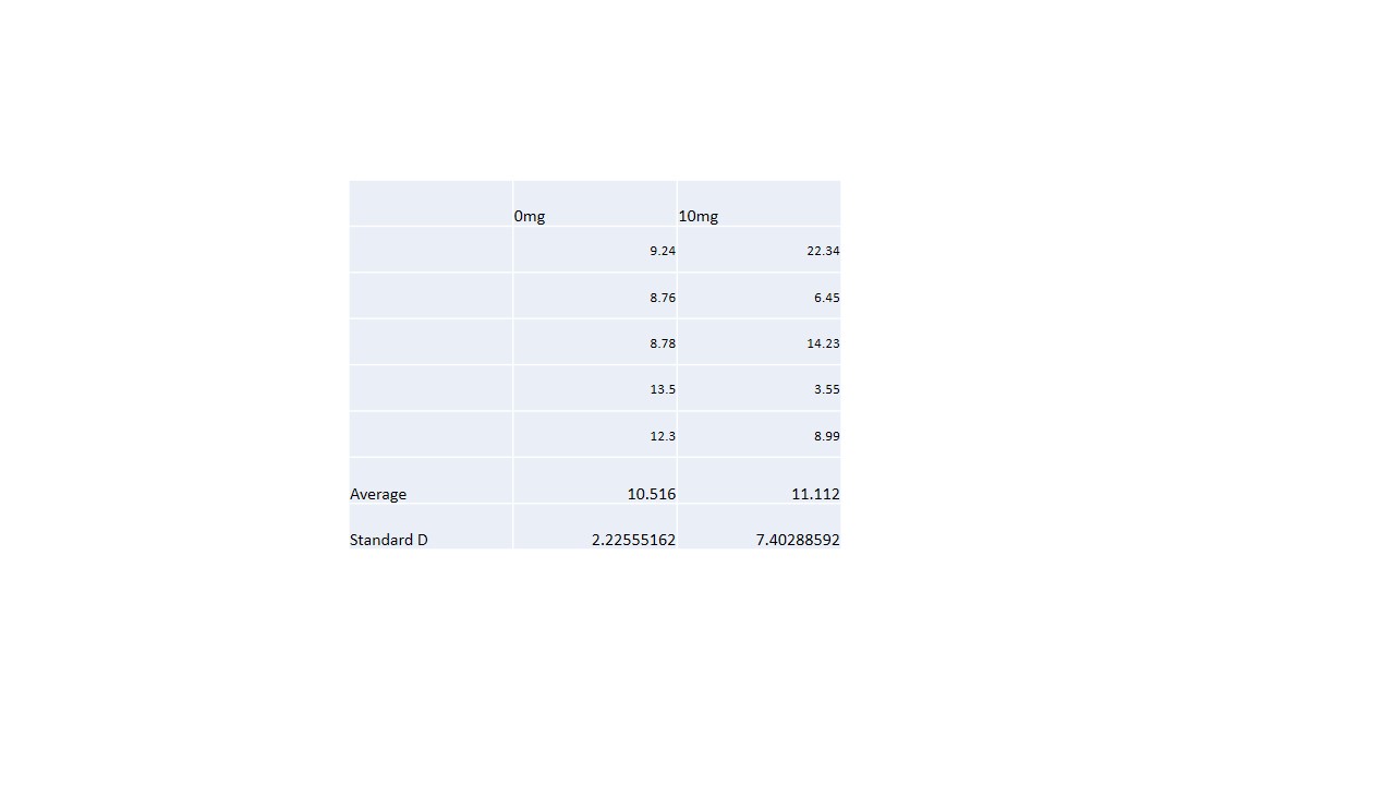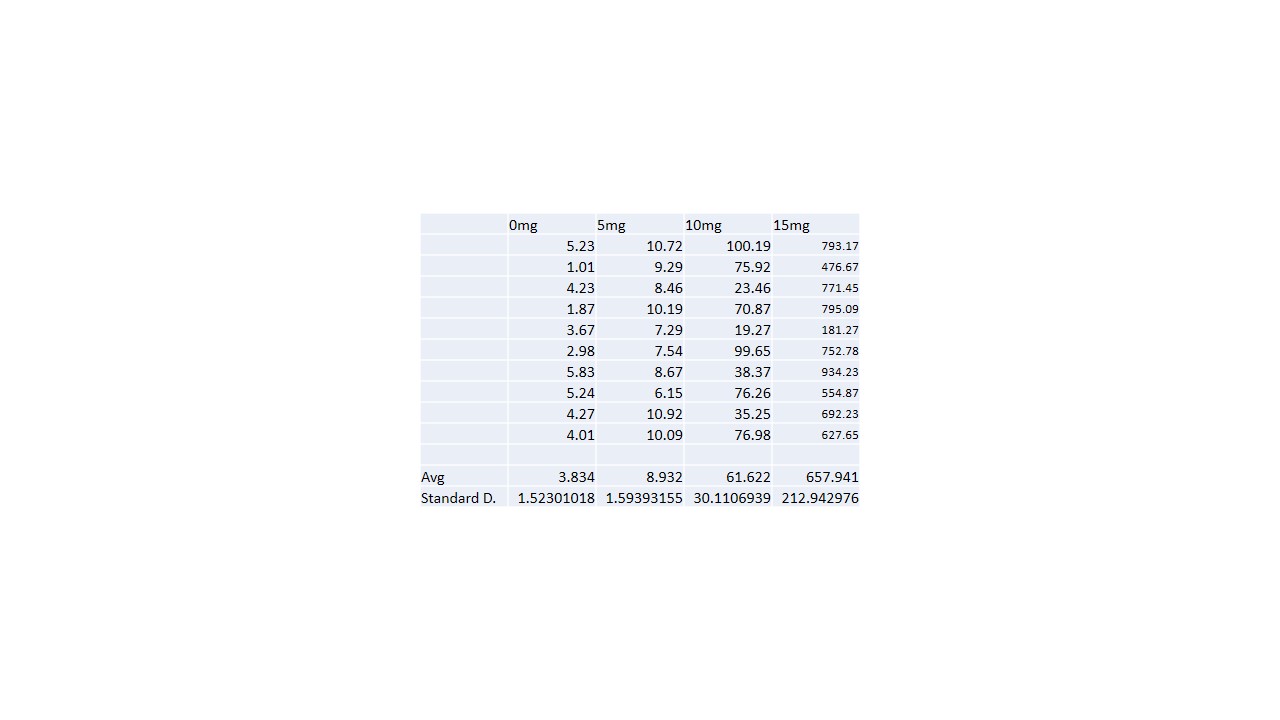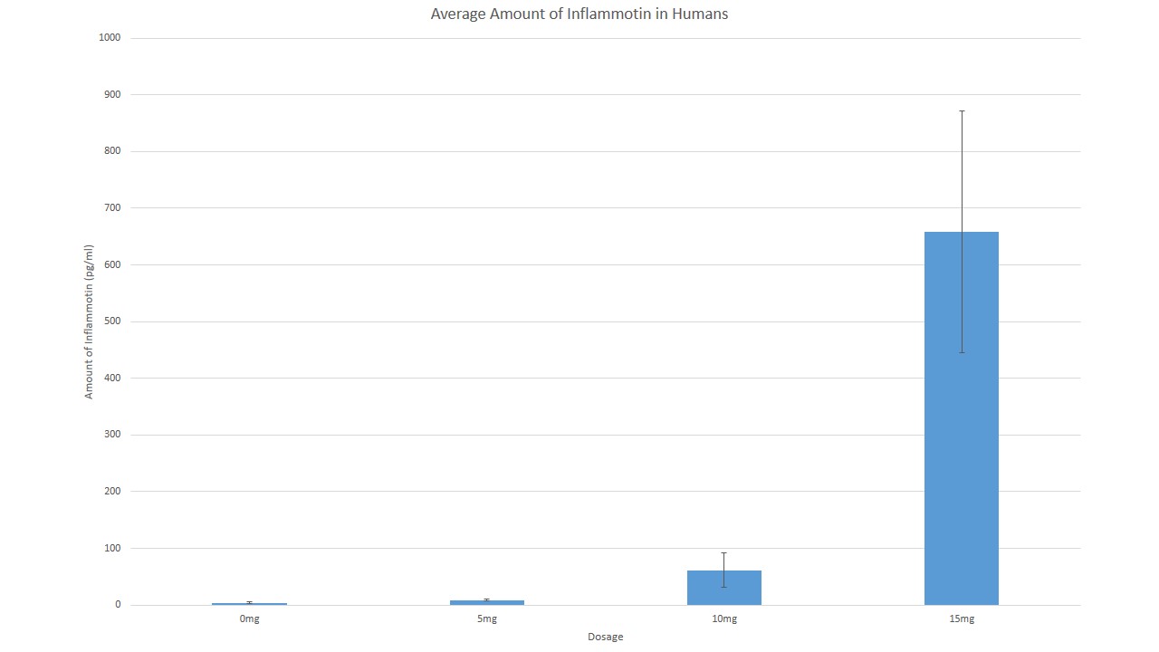 Summary/DiscussionAfter analyzing the data given, we were able to determine various calculations. We were able to calculate averages, t-tests, standard deviation and ANOVA through an excel spreadsheet. The data we analyzed for both humans and rats proved a higher dosage of the protein administered will result in an increase of inflammotin in the body. In rats, the change in the amount of inflammotin did not change much when the dosage increased from 0mg to 10mg. However, in humans, there was a steady increase in inflammotin when increasing the protien from 0mg to 5mg and 5mg to 10mg. When increasing the dosage from 10mg to 15mg in humans, the amount of inflammotin increased greatly. We can conclude that 15mg is the most effective amount of protein that should be given in order to highly increase the amount of inflammotin in the human body.