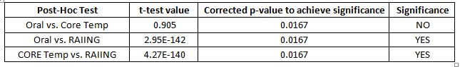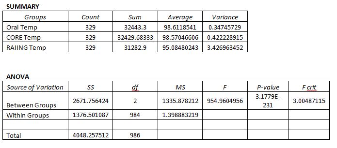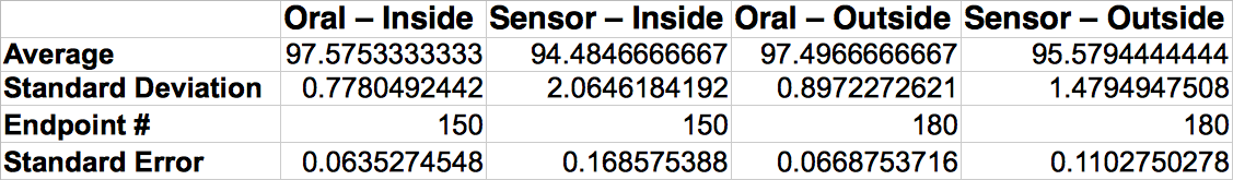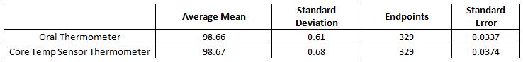 LAB 3A WRITE-UPDescriptive StatisticsIn this experiment, two medical devices are used to collect body temperature data. The first device used was the RAIING Medical Company Wireless Thermometer (Model: WTM-BT30-T). The other medical device used was a standard oral thermometer, the accepted standard for reading body temperature, against which we will compare the RAIING Wireless Thermometer. The table below shows the average, standard deviation, end point #'s and standard errors of body temperature for each medical device. Note that some measurements were taken in the lab under controlled conditions (not moving, etc.). These data are labeled "Inside". The rest of the data was taken outdoors during activity, and these data are labeled "Outside".
