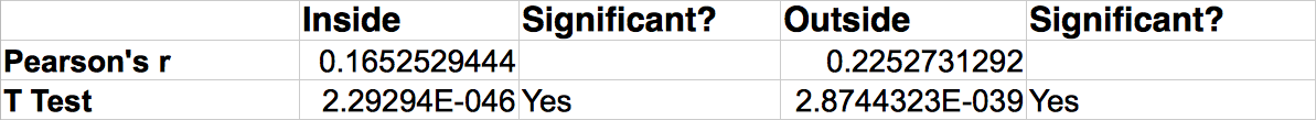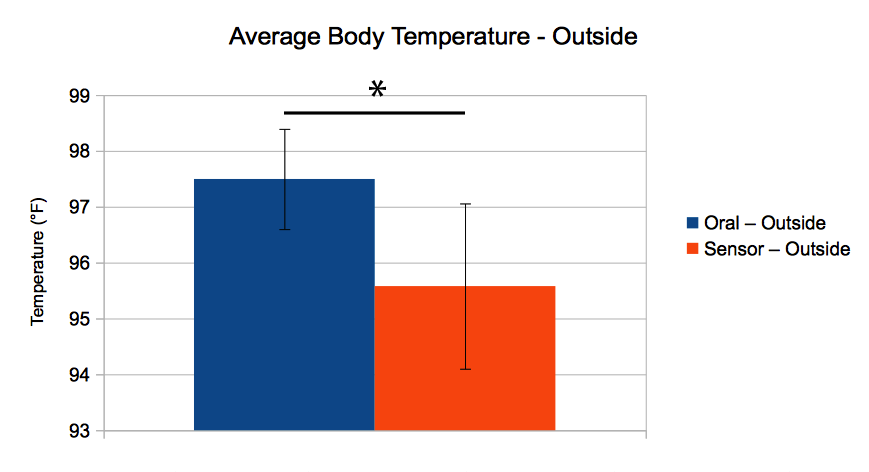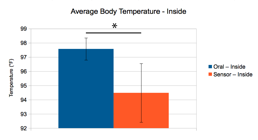Summary/DiscussionT-Test: Analysis of the data with a t-test shows that there is a significant difference between data sets: The p-value is well below the value required to achieve significance (0.05). However, we do not want a significant difference between the data from the oral thermometer and the data from the sensor. This indicates that the sensor is not accurate. Pearson's r: The Pearson's r coefficient shows that the data has little linear correlation. This implies that that, when compared with the readings from the accepted measurement device (oral thermometer), the sensor reports widely varying and inconsistent temperature readings. Thus the sensor is imprecise. Trend Line: If the sensor were to report precise data, we would expect the slopes of the trend lines to be close to one. The slope of our trend lines are well below one, indicating that the sensor does not report precise data. Standard Deviation: If we make the assumption that our standard device (oral thermometer) is precise and that our sensor is too, then we would expect both data sets to have similar standard deviations. This is not the case, with the standard deviation being greater with the sensor data for both inside and outside data sets. This implies that our sensor reports data with more variation than the oral thermometer, indicating that the sensor is not precise. Overall lack of accuracy The sensor consistently reported body temperature lower than the oral thermometer (see scatter plots and t-test), indicating that, if we take our oral thermometer (our standard) to be accurate, the sensor is not accurate. General Issues with the Sensor While using the RAIING thermometer we encountered several design/function issues. First, we were unable to achieve wireless communication between the device and an iPhone, rendering the device useless for automatic data recording (we had to manually read off data from the on-device display). Second, the device was rather large, making it difficult to position on petite people. And third, the device had to be secured tightly to ensure proper contact with the skin, resulting in some restriction of bloodflow and skin irritation. Summary All means of analysis yielded negative results for the device. We found the sensor to be inaccurate, imprecise, uncomfortable, and unreliable as a system as a whole. Possible Device Improvements We recommend a different wireless system. Bluetooth operates on 2.4GHz which can be blocked by water, a molecule that we are full of. It might be better to use a 933MHz carrier wave and have an external receiver on the the iPhone. As the device has hard and somewhat sharp edges, it might be worth looking into a design that uses a soft rubber like material (silicone perhaps) to contain the components. This way the entire device could conform to the user's shape, making it more comfortable to wear.