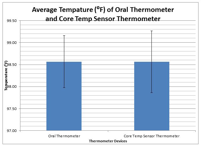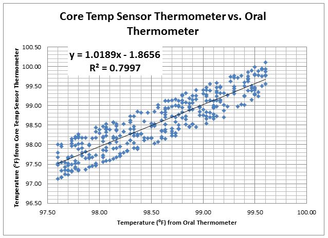 GraphTrend Line: The trend line on the above graph shows that our device reports data in an almost one-to-one ratio to the oral thermometer, indicating that our device is accurate with respect to the standard.