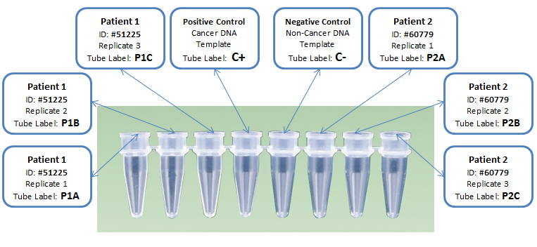DNA Sample Set-up Procedure Step 1: Plug in and turn on OpenPCR machine. Step 2: Transfer the 8 DNA samples into their respective PCR tube, making sure to use a new pipette each time. Step 3: Transfer primer mixture into each PCR tube. Step 4: Transfer PCR reaction mixture into into each of the PCR tubes. Step 5: Open the OpenPCR and place all 8 PCR tubes into the OpenPCR machine. Step 6: Program the OpenPCR machine to follow the steps outlined in "Thermal Cycler Program" above. Step 7: Close the OpenPCR and run the program. Step 8: After the machine has finished store the PCR tubes for later use.