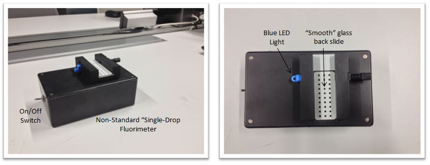 This device is used to excite the stained DNA molecules in order to generate the designed signal, a green light, for us to capture with our camera. The single-drop fluorimeter is designed to hold a single drop of the sample and pass the wavelength ~497nm of light required to excite the stained DNA molecules within the sample.
