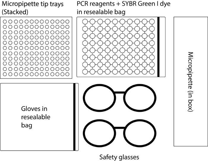 Feature 2: Consumables KitIn our kit, the consumables will consist of tubes containing the PCR reagents, tubes containing the SYBR Green I dye, the micropipette tips (to be used with the included micropipette) and safety equipment (gloves and eyewear). To ensure that users will be able to easily distinguish which tubes contain what, the tubes will have black markings on the lid to indicate contents as well as be color coordinated with their contents. Furthermore, SYBR Green I dye is prone to bleaching in the presence of ultraviolet light. Therefore, the tubes containing the SYBR Green I dye will be made out of a plastic that blocks ultraviolet light. Besides these modifications, the tubes will be the same as current PCR tubes and will be packaged as a unit (all of the tubes are connected by a small bar, and can be broken down into smaller units). Current micropipette and tip systems work well, so our kits will contain commercially available micropipettes and micropipette tips. The tips will be packaged in trays that stack on top of each other with the tips of trays on top partially inserting into the tips below. This conserves space and allows the tip tray assemblies to be packaged as a single unit. In addition to the above mentioned packaging, some consumables will have a resealable bag to safely store unused materials.