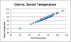 Inferential StatisticsA Pearson's r-correlation between an oral thermometer and the novel sensor indicates a coefficient of 0.9997132, or nearly complete correlation between the two data sets. A t-test demonstrates a p-value of 0.998235214, which indicates a high within-group variance relative to between-group variance, again indicating high correlation.