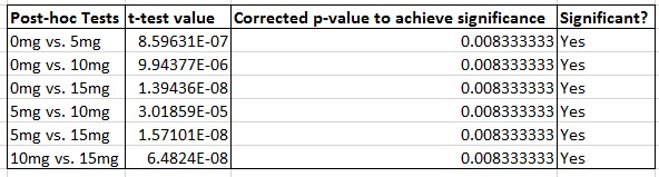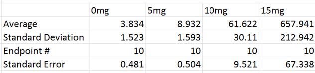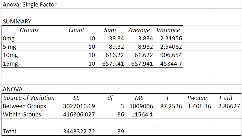 AnalysisResults from the experiment yielded a P-value of 1.40x10^-6 which is significantly lower than 0.05. From this, we took a post-hoc test to validate the significance between the individual dosages. Our data showed that there are significant differences between each of the dosages. Experiment 2 [Rat Study]