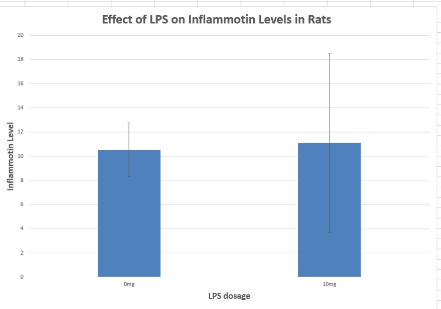 Summary/DiscussionExperiment 1 (Human Study): The analysis shows that there is a clear and present correlation between the dosage of lipopolysaccharide and inflammotin production in human subjects however there is a high variance among test subjects who took higher doses and so our data, analysis, and conclusion may be unreliable. Experiment 2 (Rat Study): Our analysis shows no correlation between lipopolysaccharide dosage and inflammotin production in rats, but since there were so few test subjects, the results may not be representative of rats as a population and so more tests would need to be done with more subjects to find definite results. From the results we can see that there is a large increase in inflammotin production in humans as the dosage of LPS increases, however we can see that the deviation between subjects increases in relation to the dosage. This large variance between subjects receiving higher doses means that more work needs to be done in order to have clear, reliable results. On the other hand there is little increase in inflammotin production in rats when the dosage of LPS increases, but like the humans there is an increase in the standard error as the dosage increases. This high deviation when there is a high dosage means that as the dosage increases, our data and consequently our results are less accurate. With that in mind, our analysis of the results in humans showed a p-value of 1.40E-16, which means that there is a definite difference in inflammotin production in relation to dosage of LPS, which means that increasing the dosage of LPS will have a significant impact on inflammotin production. In our analysis of the results in rats we found that the p-value= 0.8674035, which means there is little difference in inflammotin production between the different dosages of LPS, so increasing the dose of LPS will not cause a meaningful change in inflammotin production in rats.