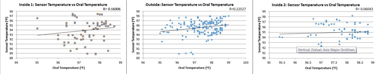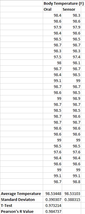 Inferential StatisticsThe data collected from the oral thermometer and the Mother's Heart arm band yielded a p-value value of 0.973214 from the t-test and an r-value of 0.984737, meaning that the data collected from the oral thermometer and the arm band are statistically similar to each other.