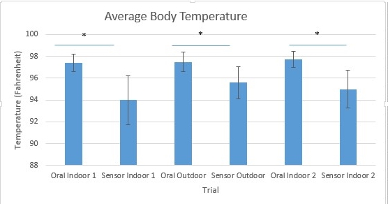 ResultsThe graph above represents the average body temperature readings for the oral thermometer data and the sensor data in the three situations: Inside, Outside, Inside. The average temperature for the oral thermometer data was higher than the average for the sensor data in all three situations. The error bars of the oral thermometer data show less variance than the error bars for the sensor data in all three situations. In addition, there was a significant difference in average body temperature between the oral thermometer and the sensor in each of the three situations.