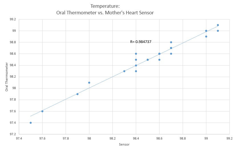 GraphThe above graph shows the average temperatures of both the oral thermometer and the Mother's Heart arm band. As shown above, the average temperatures are identical to each other. The above graph shows the relationship between the oral thermometer and the Mother's Heart arm band. The R-value signifies a positive correlation between the two data sets.