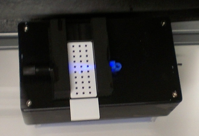 The single-drop fluorimeter device is a box that emits a blue light. A slot is present on the device for a glass slide to be placed on. Droplets of the SYBR Green dye and DNA solutions are placed on the glass slide for the light to be passed through.