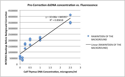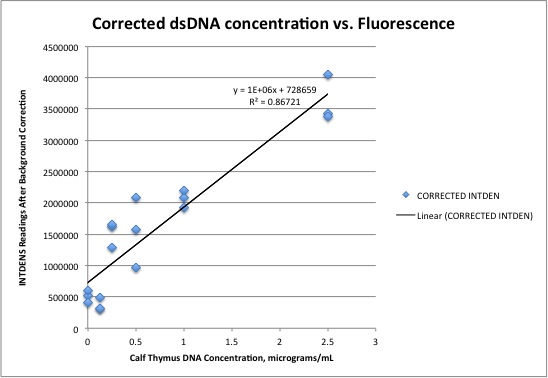 The fluorescence technique works by combining a fluorescent dye to the DNA. In this lab, SYBR Green dye was used as the fluorescent dye. The droplets will remain in place due to the Teflon coated glass. A beam of blue light is emitted from the single-drop fluorimeter and is passed through the droplet. A fluorescent green light will be emitted from the droplet which will be measured by taking a picture on a smartphone and analyzing the picture file on ImageJ.