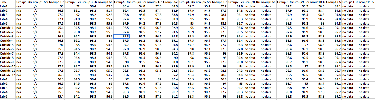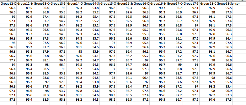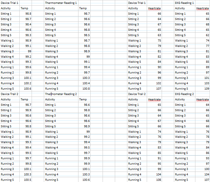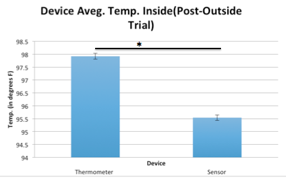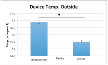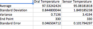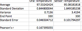 AnalysisPersonal Group Data: Because a p-value of 2.09E-72 was obtained and it is less than the given 0.05, it can be inferred that there is a statistical difference between both groups only when all the data is averaged together. When separated into three trials(inside pre-out, out, and inside post-out) It is found that there is no statistical difference between the devices, meaning they act very similarly. When a Pearson's r Test was conducted to calculate the correlation coefficient, It was concluded that the r value given is 0.167395055, which ultimately shows a weak, positive relationship between the values, verifying the results from the separated trials. Based upon the data received from the lab, it can be inferred that there is quite a difference between the readings of the thermometer and the sensor. The readings from the sensor were always lower than the ones received from the oral thermometer. While the oral temperatures given proved that the tester was healthy, the ones given by the oral readings showed a normally considered minimal temperature. For example, the initial reading that the tester's temperature was 93.7 is not possible.