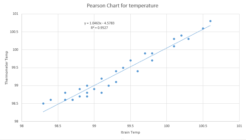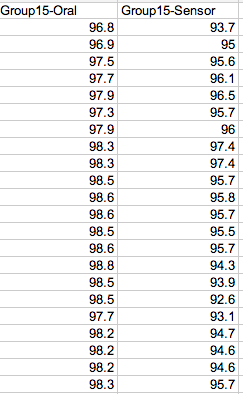 Given the inferential statistics, it can be concluded that there is a significant difference in the data according to the tests. The difference in the readings showed that the sensor acted like the tested and proven thermometer, but after the Pearson's Test it was shown that the device was not nearly as accurate or reliable as the proven thermometer. This is due do the variability of the sensor to correctly read the body temperature. Conclusion: We have concluded that the device we tested today is not not accurate, reliable, and the variability is high. The data has shown no correlation to that of the oral thermometer making it unusable and unreliable. Some flaws that we found while using the device were that it was way below the actual body temperature. The outside temperature and the temperature of the surroundings had a direct affect on the device's calculations. It also needed to be placed in an uncomfortable spot and when it was removed it would cause a bit of pain. The reading on the device itself vs the reading that was shown through the app were two completely different readings causing confusion as to which of the readings was correct. Honestly, the idea of a thermometer ran by an app is nice, however the practicality of it is not very high. The device needs to be remodeled and taken back to the drawing board, it has too many flaws to make it a viable product, even with some tweaking.