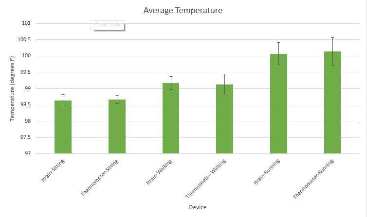 Device DesigniTrain is an armband that can be worn comfortably around an individual's arm, with a specific area for the placement of an iPhone/iPod/mp3 player to allow for the comfort of listening to music while performing physical activities. iTrain contains a wired sensor that is placed in areas around the armband, allowing for the most accurate reading of both temperature and heart rate. Because the sensor can obtain multiple readings, the chance for error is significantly reduced. The sensors, themselves, are waterproof to ensure proper readings regardless of the state of the individual. Whether they are running or swimming, iTrain will surely give the right reading. iTrain will be sold in multiple colors so as to match the colors of the newest iPhone in the market. Thus, individuals will be able to buy the special armband to compliment their phones or mp3 players. The market price for iTrain is $49.99; however, if an individual calls in at a certain time, the iTrain can be sold for a great deal of $39.99. Inferential StatisticsGiven the data from each of the tests, the t-test value between both the tests proved to be way below the p-value of 0.05, which indicates more than 95% confidence regarding our device. The statistical significance obtained proved that the data obtained was not due to merely coincidence. Both the oral thermometer and the iTrain armband are highly similar to each other. Graph