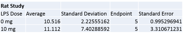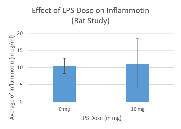 To evaluate the significance of the rat study, our group used a t test because we only had two groups to compare. A statistically significant p value is a value less than 0.05. We ran our t test, comparing the dependent variant inflammotin based on the given LPS dosage of 0 mg and 10 mg. Our calculated p value of 0.86740397, which is greater than 0.05, indicates that the difference between LPS dosages given to rats does not have a statistically significant effect on the presence of inflammotin found in the rat.
