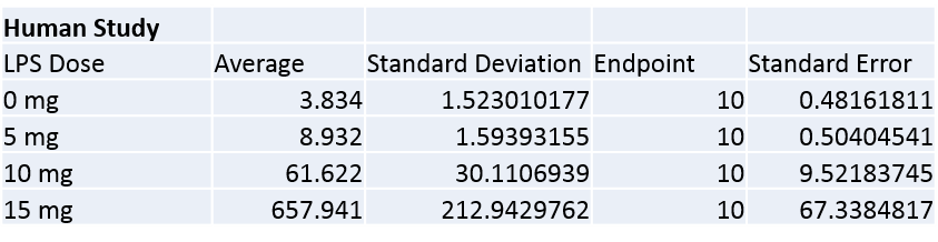 LAB 2 WRITE-UPDescriptive StatisticsUsing the raw data given we calculated averages of Inflammotin (pg/ml), standard deviation, endpoint, and standard error for each dose of LPS. Experiment 1:Human Study Experiment 2:Rat Study