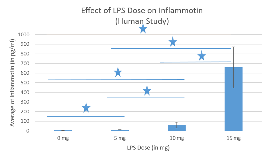 ResultsExperiment 1: Human Study This bar graph displays that as the dose of LPS increases, the average amount of Inflammotin found in the elderly increases. Each group has ten subjects. The error bars represent our standard deviation. The stars represent the statistical significance between each dosage amount.