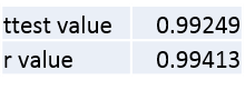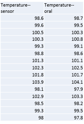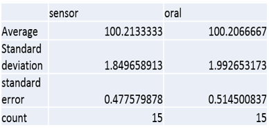 Inferential StatisticsThis table displays the data collected from the sensor and from an oral thermometer. This table displays the descriptive statistics resulting from the data sets. The average temperature for device reading is listed as "average". This table lists the inferential data analysis resulting from the data sets. A t-test was conducted to evaluate the significance between the two device reading. the p-value which was calculated from the data collected (the value listed next to "ttest") is 0.99249, which falls far outside the boundaries of the a statistically significant p value. In this case, however, it is important for the p-value not to be statistically significant. Another one of the company's goal is for the sensor to be as accurate as possible to an individual's actual temperature and a statistically significant p-value would indicate that the sensor is providing the wrong results.  The Pearson's r value is 0.99413.