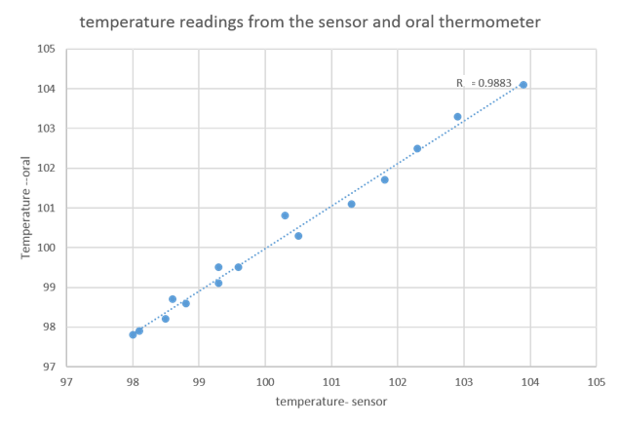 GraphThis graph shows the relationship between the temperatures collected from the oral thermometer and sensor. The r correlation is listed at the top right corner of the graph.