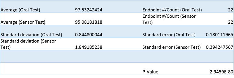 AnalysisIn order to determine whether there was a statistical difference between the oral readings and the sensor readings, a statistical t-test was ran using Microsoft Excel. When this statistical test was ran, the p-value that was calculated was: 2.9459E-80. Putting this in context of the experiment, it could be conclude that there is a statistical significance between the oral data and the sensor data. Now that it was evident that there was a statistical difference the data analysis was taken one step further and the Pearson's r-correlation was calculated to determine whether there was a connection between the two groups. To calculate this value, all of the data was plotted into a scatter plot. The scatter plot was used to determine the R value. The r-value calculated was 0.57504.