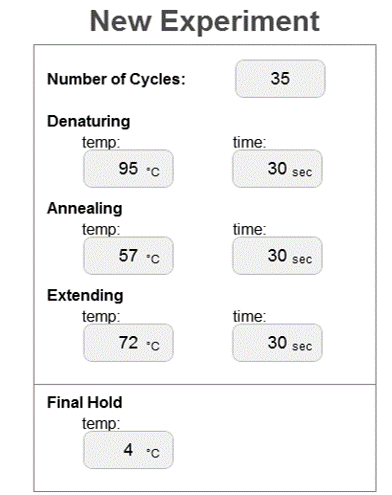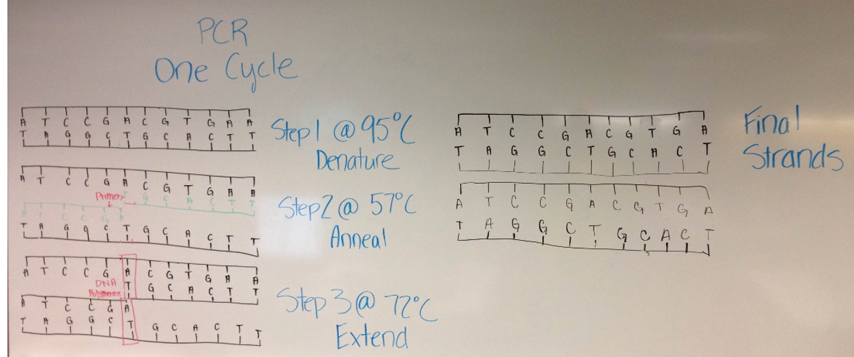 Research and DevelopmentPCR - The Underlying Technology Function of PCR Components The Polymerase Chain Reaction requires many components to amplify the desired DNA sequence. A DNA template is necessary to begin the entire PCR process because it has a section of interest. The billions of DNA copies that result at the end of PCR are all derived from this original DNA template. Primers are needed to replicate DNA and are used in the normal DNA replication process. The primers used in PCR recognize a desired segment of DNA and bind to the DNA strand after denaturation has finished. By having a specified base sequence segment to bind to, the primers begin the process of targeting and isolating the DNA portion of interest. The job of a primer in DNA replication and PCR is to tell DNA polymerase where to start adding the complementary base pairs to the DNA strand. In PCR, primers are unique because they can be synthetically made to target a specific DNA segment. However, regular human DNA polymerase cannot be used in PCR because it cannot withstand high heats; instead, Taq polymerase, a polymerase taken from a thermophilic bacteria, is used to add the complementary base pairs to the DNA strands. Taq polymerase is used because it can withstand the heat cycles required in PCR. Magnesium chloride is used to help stabilize Taq polymerase which depends on a magnesium concentration to function properly. dNTPs are the single A, T, C, G bases and are the building blocks for the new DNA strands. For creating the new strands of DNA, the base pairing is very important. The base pairings go as follows: Adenine (A) pairs with Thymine (T), while Cytosine (C) pairs with Guanine (G). The pairings are also true vice-versa. So in other words, Thymine (T) pairs with Adenine (A) while Guanine (G) pairs with Cytosine (C). Steps of PCR The first step of PCR is a 3 minute cycle that heats to 95 degrees Celsius. During this step, the DNA unravels from its double helix formation and lines the two strands of DNA parallel to each other. This step of the PCR aligns DNA properly for the other steps to occur. Denaturation is the next step and lasts for 30 seconds and is still held at the 95 degrees Celsius. In this step, the hydrogen bonds holding the complementary base pairs break and the two DNA strands separate from one another. Annealing lasts for 30 seconds and the temperature drops to 57 degrees Celsius. This is the point in PCR where the primers bind to the DNA strands. After annealing, extension occurs. Extension is a 30 second process held at 72 degrees Celsius in which the Taq polymerase adds the complementary base pairs to the DNA strands starting at the primer. The final step is also at 72 degrees Celsius but lasts for 3 minutes. This step allows Taq polymerase to find all of the primers in the DNA sequences. The last step is the hold. The final hold is at 4 degrees Celsius and is meant for investigating how much DNA is in the sample after PCR has cycled.