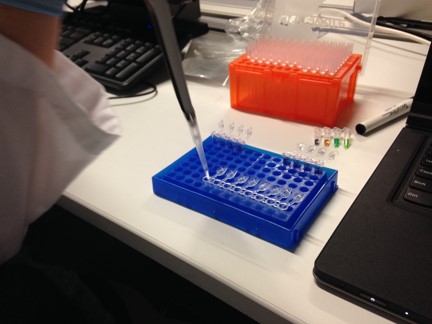 How the primers work: During the denaturing of DNA in the PCR reaction, the 94°C temperature causes the double helix DNA to unwind and separate into two complementary strands. As the process moves along to the annealing step, the primers attach themselves to the target sequence which is used as a template for the amplification. In this situation, the target sequence is the rs 17879961 SNP which is the cancer-associated SNP. In simple terms, PCR is the amplification of the target sequence and since the target sequence here is the cancer-associated SNP, this particular SNP will be found in every PCR result because that specific sequence was used as the template of the amplification. Feature 2: Consumables KitThe consumables, such as the micro-pipette tubes, micro-pipette, tips, PCR primers, and PCR mix will be packaged in an unfoldable box that functions as a "mini-lab station". The micro-pipette tubes will be packaged and stored in micro-pipette tube racks that are built into the sides of the box. While the racks can remain on the sides of the box, they are also removable so the individual can place the racks on the table to have better access to specific tubes during the experiment. The micro-pipette tubes will also have a non-glossy, smear-free coating on the side to make labeling each tube easier. A black foam stand with holes to insert micro-pipette tubes into is also included. Similar to the design of a micro-pipette tip holder, this stand is intended to hold micro-pipette tubes that have PCR mixtures, primers, and SBYR green. The PCR mixtures and primers come in clear bottles and are stored in a black foam stand.