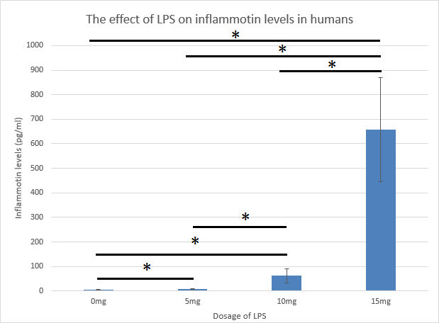 AnalysisLPS effects on Inflammotin levels in Humans Since this experiment involved more than 2 groups, the ANOVA test was used, and it showed that the p-value was 1.40E-16, which signifies that the results were statistically significant. The post-hoc test, Bonferroni Correction, was applied to reinforce confidence in results. T-tests were completed for 6 comparisons: 0 to 5mg, 0 to 10mg, 0 to 15mg, 5 to 10mg, 5 to 15mg, and 10 to 15mg. The p-values of the 6 t-tests were, respectively, 8.60E10-7, 9.94E-6, 1.39E-8, 3.02E-5, 1.57E-8, and 6.48E-8. To adjust, the alpha-value of 0.05 is divided by the number of comparisons (6). This quotient ended up being higher than each of the p-values of the t-tests, signifying that the results are statistically significant. LPS effects on Inflammotin levels in Rats