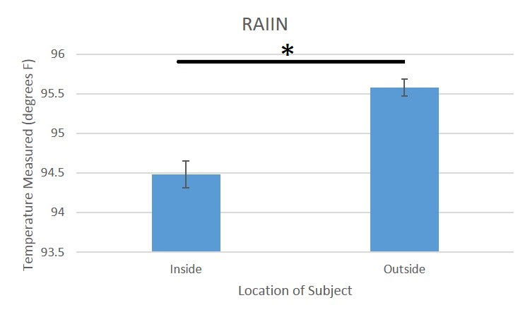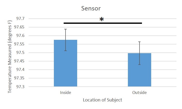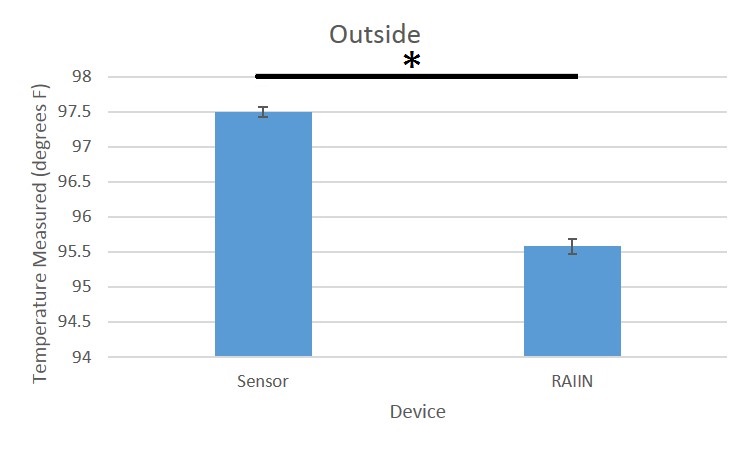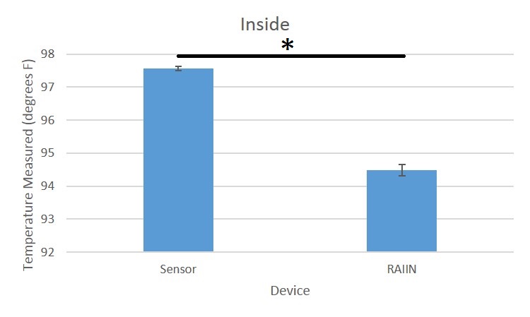 Summary/DiscussionThe results showed that there is a low p-value from the t-tests, showing that there exists a difference between the values collected by each device. There were various errors with the RAIIN device itself. Phone signal and interference from other phones gets in the way of measuring one person's body temperature. In addition, there should be a different name for the Bluetooth for each device so that the user won't confuse one device's Bluetooth with another. Another problem with RAIIN is its indecipherable, ambiguous instructions. It is difficult to determine where the sensor should be placed on the arm with just a simple picture. The instructions should be more specific so that the user gets the most accurate results. Lastly, the RAIIN sensor is easily affected by the temperature of the environment, increasing in its measurement of body temperature outside and decreasing inside. The difference was more apparent inside as the temperature inside a room is further from normal body temperature than outside in the sun. To fix this, there should be some type of insulation system so that the environment temperature doesn't affect the sensor readings. In conclusion, the RAIIN sensor iPhone app was found to be unreliable in measuring body temperature.