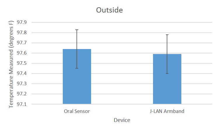 Inferential StatisticsTaking a T test comparing the thermometer readings set of results with the J-LAN Armband set of results, both contained within the inside data set, the result was p = 0.239875, p > 0.05 which signifies that there is a low level of confidence in a difference existing within the two data sets. Furthermore, upon taking the Pearson's r correlation test it was found that there is only a positive correlation level of 0.974094 between the temperature readings data set and the armband data set within the context of the larger inside data set. This is a high correlation and so it is safe to conclude that the two data sets are significantly similar within the context of inside readings taken. Taking a T test comparing the thermometer readings set of results with the J-LAN Armband set of results, both contained within the outside data set, the result was p = 0.141642, p > 0.05 which signifies that there is a low level of confidence in a difference existing within the two data sets. Furthermore, upon taking the Pearson's r correlation test it was found that there is only a positive correlation level of 0.982099 between the temperature readings data set and the armband data set within the context of the larger outside data set. This is a high correlation and so it is safe to conclude that the two data sets are significantly similar within the context of inside readings taken. However, since both the inside data set and the outside data set led to the same conclusion upon running the statistical tests, it is safe to predict that upon running similar statistical tests on all readings, inside and outside, the results will be similar. In fact this is found to be true because when taking the outside data set and inside data set together with the new set separation being solely the set of readings taken with the thermometer and the set of readings taken with the armband, a t-test result was found, 0.06348, which again indicates that there is a significant similarity between the readings taken with the thermometer and those taken with the armband. And with a correlation of 0.978159 found between these two sets, it is safe to further strengthen the conclusion that the readings taken with the two devices are very similar, so the J-LAN Armband has very accurate readings.