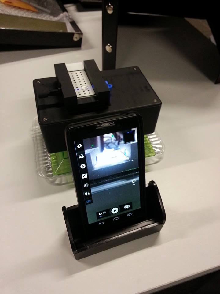 This device detects DNA based off of fluorescence from a molecule bound to the DNA such as SYBR green dye. The DNA sample that is placed on the slide which is then inserted in the machine and shined with blue LED light. After the light hits the sample, the DNA should emit a dim green glow. To collect data a phone is used to capture the green light.