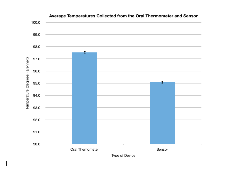 Summary/DiscussionOur experiment results showed that the oral thermometer was more accurate than the external sensor because of the lower standard deviation. The external sensors however still produced decent readings and would be a more convenient way to measure someone's temperature. Possible sources of error would be the placement of the external sensor because during the experiment, it would move and slide around which may have skewed the data and given a less reliable reading. Also, the phone lost connection with the sensor repeatedly and the phone tried to connect with other sensors that were in close range. This product can be improved by having a stronger signal connection and a sleeve that someone can wear so that the sensor does not move and stays properly positioned to give accurate temperature readings.