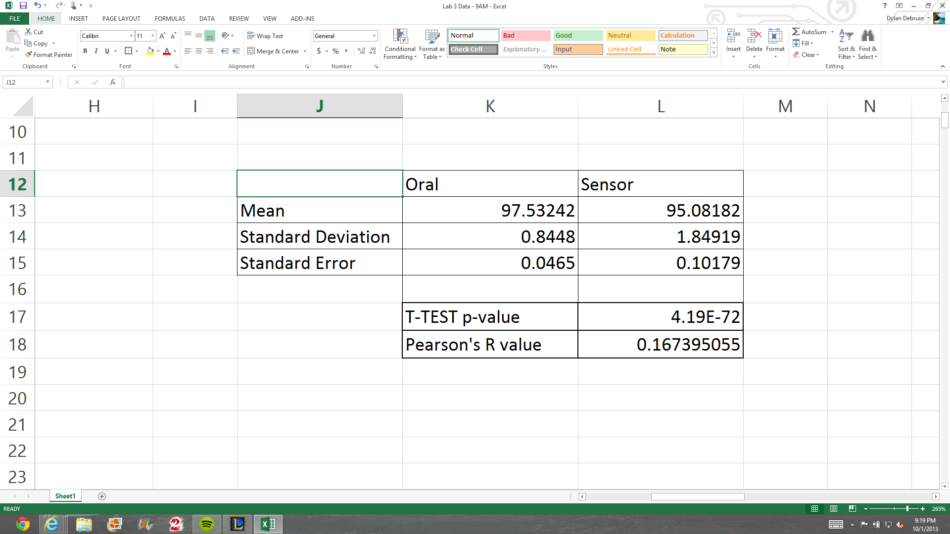 LAB 3A WRITE-UPDescriptive StatisticsOral Data: Minimum- 95.0 Maximum- 99.0 Median- 97.7 Mean- 97.5324242 Standard Deviation- .84480004 Sensor Data: Minimum-88.8 Maximum-98.2 Median- 95.3 Mean- 95.0818182 Standard Deviation- 1.84918524