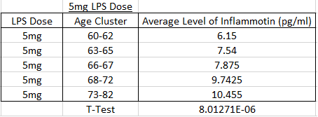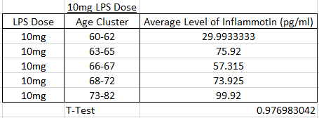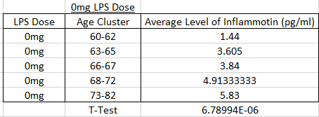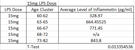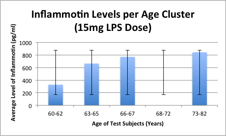 Age is one of the factors that influence the effects of LPS. When looking at the 0mg bar graph comparing different age groups, inflammotin levels seemed to increase with age. In addition, the 5 and 15mg dosage seemed to have a greater effect on inflammotin levels as age increased.