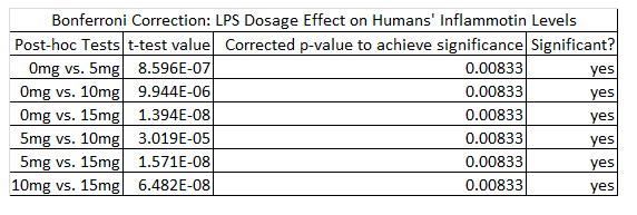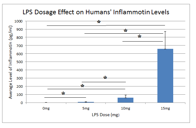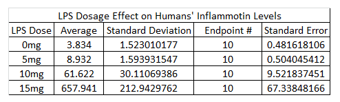 In contrast, the differences of inflammotin levels in humans when given different doses are significant. This is seen in the ANOVA Test and the LPS Dosage Effect on Inflammotin Level graph. On the ANOVA Test, the p value was less than 0.5, which means that LPS has a great impact on the inflammotin levels in humans. On the graph, an * on a line indicates that there is a significant difference between two of the doses. This was determined by running multiple t-tests and using the Bonferroni Correction Test where the p-value was corrected to 0.5/4 (0.0083). Since all six comparisons had a p-value less than 0.0083 then that means there is a significant difference among all six. Standard deviation describes the variability of the data within each dosage group.The lowest standard deviation was among the 0mg dosage group because people started out with similar inflammotin levels. However, the standard deviation was the highest within the 15mg group. LPS dosage does not affect everyone's inflammotin levels the same because there are other factors that play a role in how people react to LPS (age, race, genes, etc.).