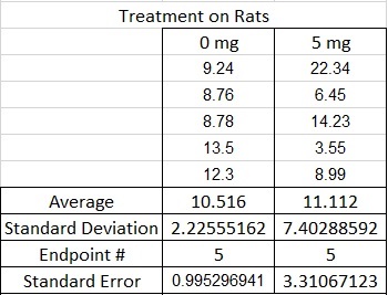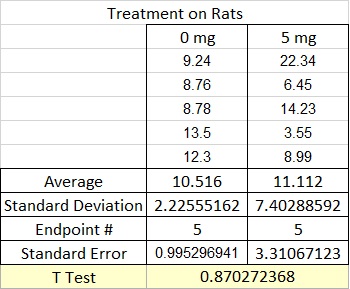The different doses of LPS on rats is insignificant based on the T Test of the data observed from the 0 mg and 5 mg doses. The T Test value of 0.87 is much higher than the value of .05 which indicates that the value is insignificant (.087 > .05).
